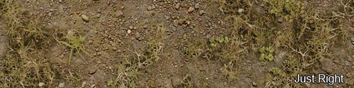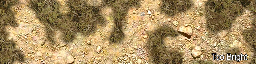 Since this system creates sharper transitions between landscape textures, it's especially important that you make smart decisions about which textures to layer together. The greater detail can reveal some bad combinations that just got smeared together in the old fashioned shader system. There are two important concerns to keep in mind: levels, and pattern.